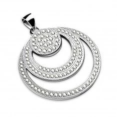 Přívěsek z oceli, plný kroužek vykládaný zirkony, tři zvětšující se kruhy ozdobené kulatými zirkony, hladké hrany. Hrany přívěsku jsou zaobleny a se zrcadlově lesklým povrchem. Přívěsek má podlouhlé očko na řetízek, které se směrem nahoru mírně rozšiřuje. Průměr přívěsku: 39 mm Šířka očka na řetízek: 4,5 mm
