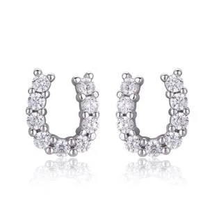 Stříbrné náušnice podkovy dekorované zirkony čiré barvy Náušnice jsou vyrobeny ze stříbra s jakostním označením 925-1000 a povrchově upraveny rhodiováním Rhodium patří mezi drahé kovy, patřící do skupiny platinových a chrání stříbro před černáním, zvyšuje lesk šperků Parametry materiál stříbro (Ag 925-1000) povrchová úprava rhodium druh kamene zirkon typ uzávěru puzeta šíře náušnic 8,5 mm výška náušnic 10 mm hmotnost 1,30 g