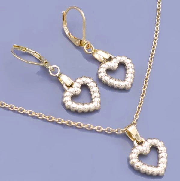 Dámská souprava z chirurgické oceli, náušnice s přívěskem. Pozlacené galvanizováním 14 kar. zlatem v ČR. Velikost srdíček 13x12mm. Celková délka náušnic je 33mm, zapínání pohodlné na klapku. Přívěsek je zavěšen na řetízku o šířce 1,5mm a délce na výběr od 40-45-50-55cm Pozlacené šperky při správné péči vydrží dlouhé roky. 22193