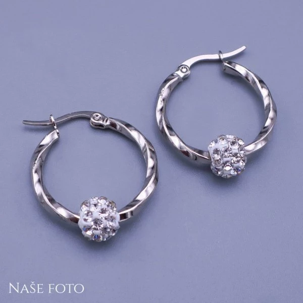 Luxusní dámské kruhové náušnice z chirurgické oceli. Kruhy jsou menší velikosti o průměru 2,4cm. Po svém obvodu jsou kroucené, zdobené pohyblivou kuličkou bílé barvy se třpytivými kamínky. Jsou velice elegantním doplňkem, vhodným na plesy, večírky, svatby, ale díky své menší velikosti se hodí také pro každodenní nošení. Šperky z chirurgické oceli jsou vhodné pro osoby s alergiemi na běžné kovy. Šířka náušnice: 2mm Průměr kruhu: 2,4cm Průměr kuličky: 7mm Zapínání náušnic: tyčinkové 8063