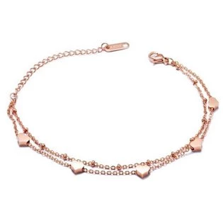 Zlacený dámský ocelový náramek zdobený navlečenými srdíčky Ocelový náramek je vyroben z chirurgické oceli s jakostním označením 316L s povrchovou úpravou v barvě růžového zlata Parametry materiál chirurgická ocel povrchová úprava růžové zlato délka náramku 16 cm + 5 cm