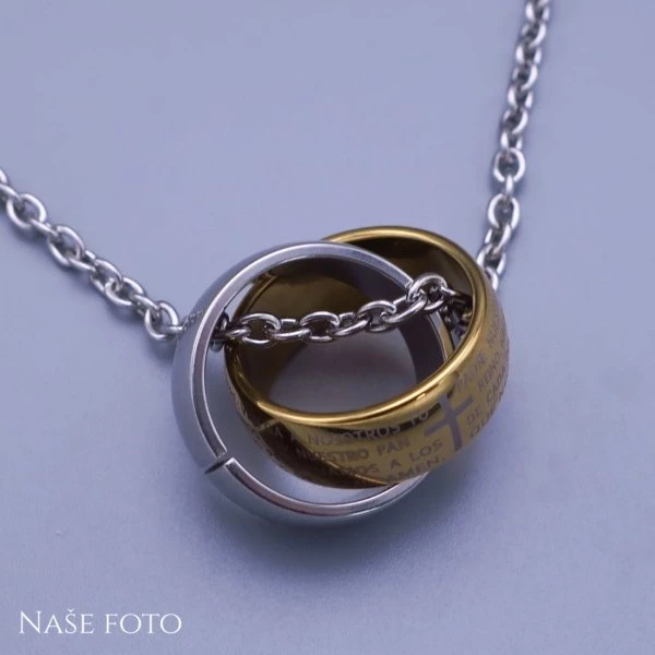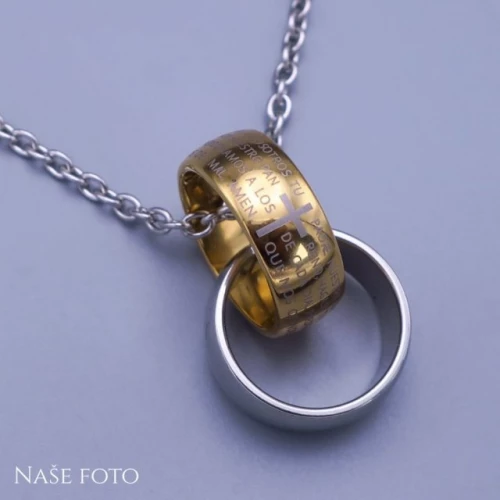 Krásný přívěsek z chirurgické a pozlacené chirurgické oceli, složený ze dvou propletených prstenů. Prsten stříbrné barvy je hladký, bez zdobení, vyrobený chirurgické oceli. Druhý z prstenů je vyroben z pozlacené chirurgické oceli a je zdoben rytým textem a křízkem. Součástí přívěsku je také řetízek stříbrné barvy z chirurgické oceli o šířce 3mm a volitelné délce od 40cm do 70cm. Oba prsteny jsou navzájem propleteny a můžete si je na řetízek provléknout různými způsoby, pokaždé tak bude vypadat tento přívěsek trochu jinak. Šperky z chirurgické oceli jsou vhodné pro osoby s alergiemi a kožními reakcemi na běžné kovy. Délka řetízku: volitelná od 40-45-50-55-60-65-70cm Šířka řetízku: 3mm Šířka prstenu: 8mm Průměr jednoho prstenu: 2cm 8004