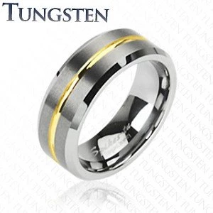 Prsten z wolframu Matný wolframový prsten zdobený matným pruhem a zlatou linkou ve středové části Wolfram je v současnosti nejtvrdší a nejodolnější kov, používaný k výrobě šperků. Wolframu je 10 krát tvrdší než 18ti karátové zlato a… 5 krát tvrdší než ocel … a 4 krát tvrdší než Titan. Stupeň tvrdosti wolframu se pohybuje mezi 8-9 na stupnici tvrdosti (diamanty mají tvrdost 10 - nejvyšší na této stupnici). Proč je to toto důležité? Vysoká tvrdost wolframu zaručuje trvalý lesk šperků a jeho absolutní odolnost proti poškrábání. materiál karbid wolframu šíře prstenu 8 mm Vyberte variantu: 60 72