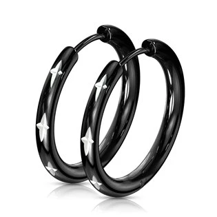 Černé ocelové náušnice kroužky zdobené křížkovým dekorem Náušnice jsou vyrobeny z chirurgické oceli s jakostním označením 316L materiál chirurgická ocel povrchová úprava černá typ uzávěru kroužek průměr náušnic 16 mm šíře náušnic 2 mm