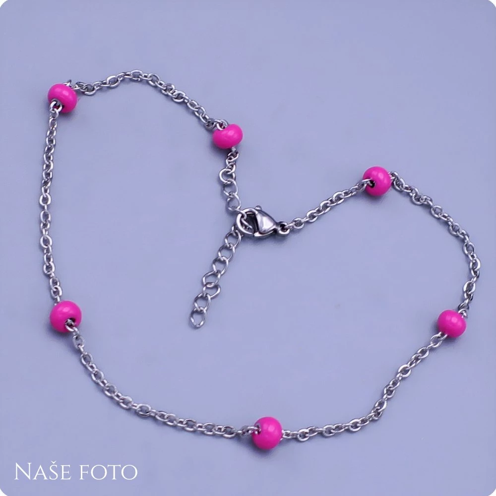 Řetízek na nohu z chirurgické oceli o šířce 2mm zdobí růžové perličky 5mm. Délka nastavitelná od 25cm - 29cm. K řetízku na nohu nabízíme také náramek a řetízek na krk. 2087