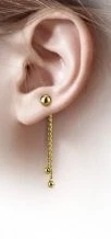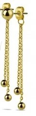 Náušnice z chirurgické oceli sestávají z lesklé hladké kuličky. Na brzdítku jsou ze zadní strany ucha uchyceny dva řetízky - kratší a delší. Oba řetízky ukončuje lesklá kulička. Zapínání je puzetové. Rozměry náušnic: 5 x 50 mm