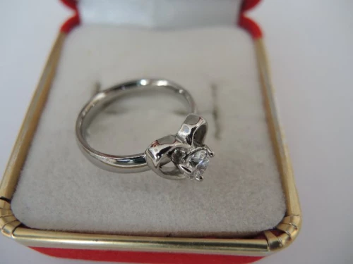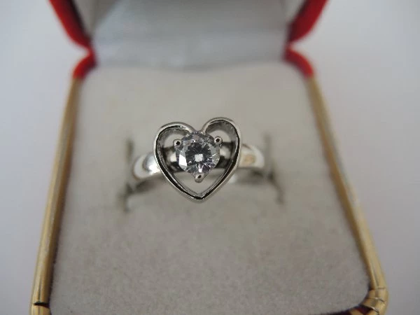 Prsten z chirurgické oceli stříbrné lesklé barvy je zdoben srdíčkem, uprostřed kterého je v kotlíku uchycen čirý kulatý zirkon. Šířka: 3,5 mm Rozměry ozdobné části: 11 mm x 10 mm Velikost 57