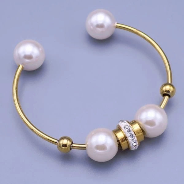 Dámský zlacený náramek z chirurgické oceli je zdobený bílými korálky 12mm azlaceným korálkem s čirými zirkony 9mm. Průměr 6cm Velikost UNI ale spíše na užší zápěstí. Šířka náramku 2mm. Bez niklu. 59
