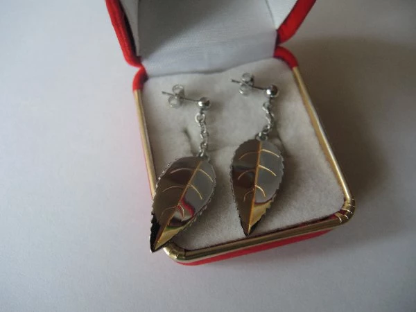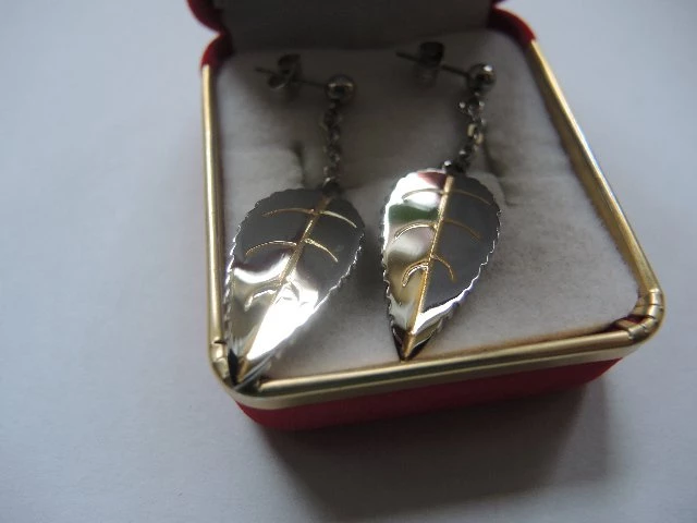 Visací náušnice ve tvaru lístku zdobené zlacením Rozměry 42x12mm Zapínání na puzetku