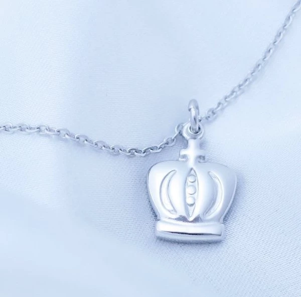 Oboustranný přívěsek korunka z leštěné chirurgické oceli o velikosti 12x11mm, je zavěšen na řetízku z chirurgické oceli. Řetízek o šířce 2mm. Délka na výběr od 40-45-50-55-60cm 000083