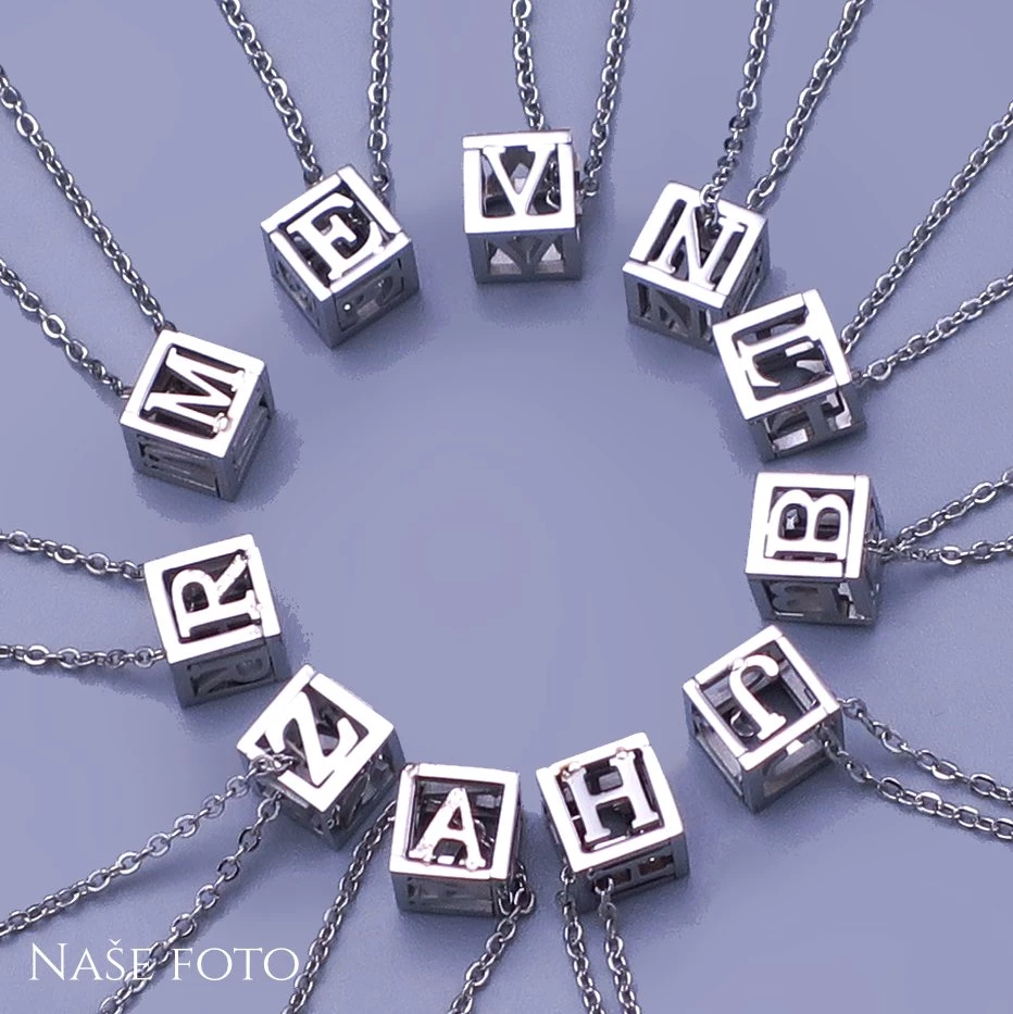 Přívěsek z leštěné chirurgické oceli 3D kostička je z každé strany označena písmenkem. Výběr písmen : A, B, D, E, H, J, K, L, M, N, P, R, S, T, V, Z Velikost kostičky 6mm Přívěsek je zavěšen na řetízku z chirurgické oceli o šířce 1mm. Délka nastavitelná od 47cm do 52cm. 000051