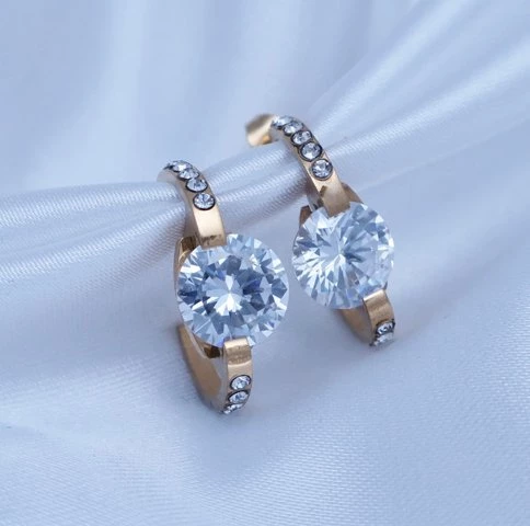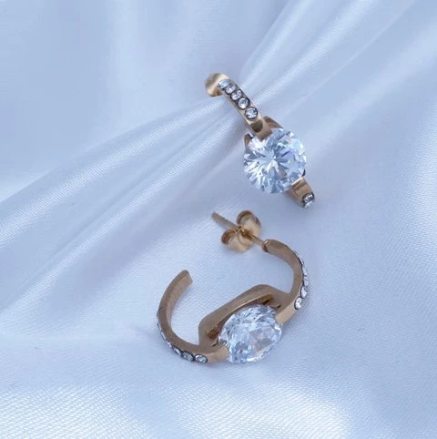Náušnice z chirurgické oceli polokroužky jsou zdobené čirými zirkony. Větší zirkon s výrazným brusem 8mm Délka 18mm Šířka 2mm Povrchová úprava zlacení. Chirurgická ocel je vhodná pro alergiky na běžné kovy. 00001