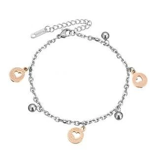 Dámský ocelový náramek dekorovaný zavěšenými přívěšky Náramek je vyroben z chirurgické oceli 316L Parametry materiál chirurgická ocel povrchová úprava lesklá, růžové zlato délka náramku 18 cm + 5 cm rozměr kuliček 5 mm rozměr přívěšků 9 mm