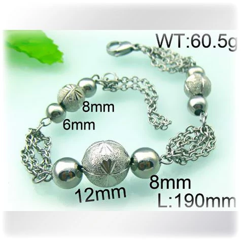 Náramek z chirurgické oceli zdobený perlami Největší perla zdobená pískováním a rytím o rozměru 12mm Menší hladké perly o rozměru 6mm Perly menší zdobené pískováním 8mm Délka náramku 190mm Náramek spojen 4řetízky 7NB29270