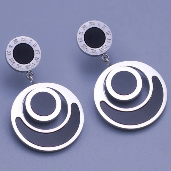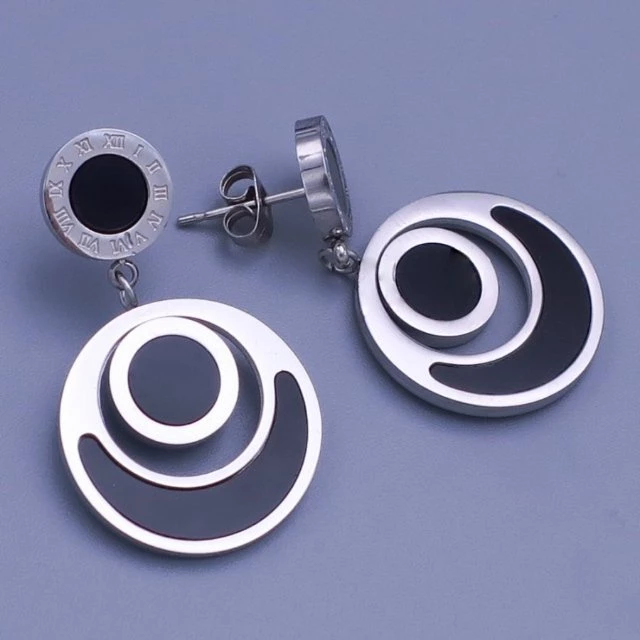Dámské visací náušnice kruhy z chirurgické oceli. Zdobené černěním. Celková výška náušnic 35mm. Průměr koleček 20mm a 10mm. Zapínání na puzetu. 3012