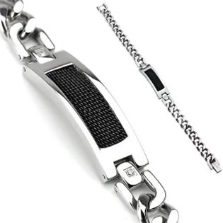 Pánský ocelový náramek s destičkou zdobenou černou výplní a zirkonem na každé straně Náramek z chirurgické oceli 316L Ocelový náramek je vyroben z chirurgické oceli s jakostním označením 316L. Tento druh oceli nekoroduje (náramek tedy nerezaví), je antialergenní a splňuje náročné parametry pro šperky přicházející do styku s pokožkou, které jsou dány normami EU. Parametry materiál chirurgická ocel povrchová úprava lesklá délka náramku 22 cm šíře náramku 12 mm