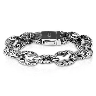 Motorkářský ocelový náramek Náramek je vyrobený z chirurgické oceli 316L Ocelový náramek je vyroben z chirurgické oceli s jakostním označením 316L. Tento druh oceli nekoroduje (náramek tedy nerezaví), je antialergenní a splňuje náročné parametry pro šperky přicházející do styku s pokožkou, které jsou dány normami EU. Finální úprava oceli - leštění, odstraní z náramku veškeré nerovnosti a dodá ocelovému šperku konečný lesk, který přetrvá dlouhá léta. materiál chirurgická ocel povrchová úprava lesklá délka náramku 22 cm šíře náramku 17 mm
