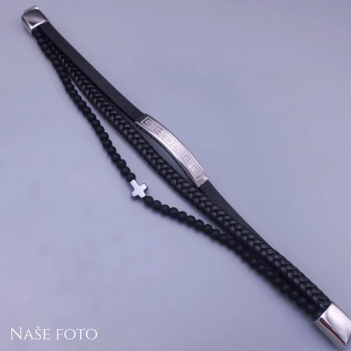 Výrazný náramek spojuje tři prvky: hladký kožený pásek, pletený řemínek a matné černé korálky doplněné o decentní křížek. Středovou dominantu tvoří chirurgická ocel s elegantním řeckým motivem, který dodává náramku nádech historie a síly. Ideální doplněk pro muže, který ví, co chce – a nebojí se to ukázat.