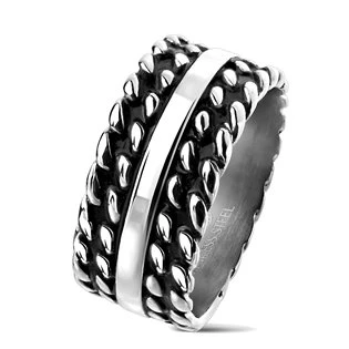 Pánský ocelový prsten s řetězovým dekorem Prsten je vyroben z chirurgické oceli s jakostním označením 316L Parametry materiál chirurgická ocel povrchová úprava černá, lesklá šíře prstenu 10 mm Vyberte variantu: 60 62 65 68 69