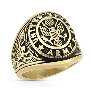 Pánský ocelový prsten dekorovaný symbolem US Army Seal Materiál prstenu: chirurgická ocel 316L Parametry materiál chirurgická ocel povrchová úprava žluté zlato šíře prstenu 23 mm Vyberte variantu: 62 65