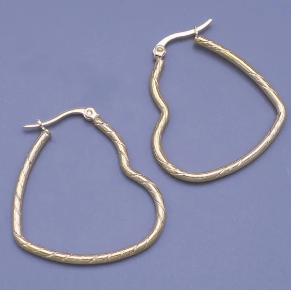 Náušnice z chirurgické oceli srdíčka jsou povrchově upraveny zlacením 14kar. v ČR. Odstín českého zlata bez niklu. Velikost na výběr 35mm, 45mm. Šířka náušnic 2mm. 22407