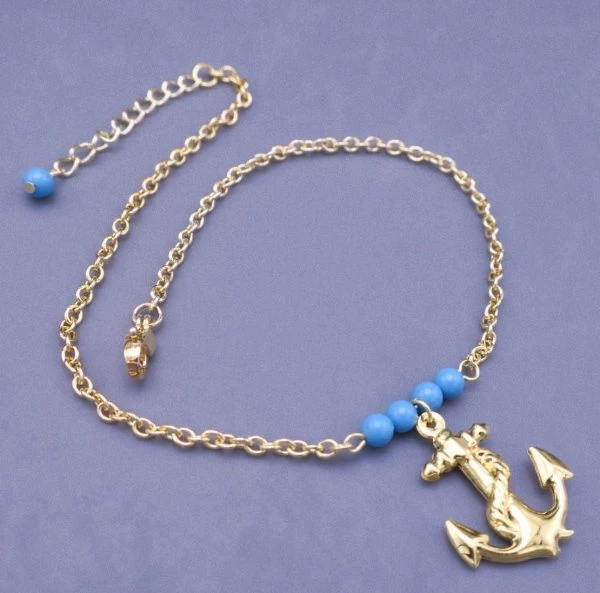 Řetízek na nohu z chirurgické oceli je povrchově upraven zlacením 14kar. V ČR v odstínu českého zlata. Řetízek zdobí přívěsek kotva o velikosti 20mm a modré korálky Swarovski. Šířka řetízku 2mm. Délka je nastavitelná od 24cm - 28cm. Pokud vám délka nevyhovuje, napište do poznámky k objednávce délku kterou potřebujete. 22287