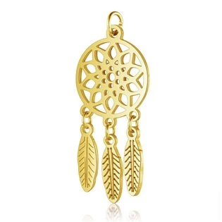 Ocelový přívěšek ve tvaru lapač snů Přívěšek je vyroben z chirurgické oceli 316L Parametry materiál chirurgická ocel povrchová úprava žluté zlato rozměr přívěšku 14 x 35 mm tloušťka přívěšku 1 mm