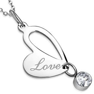 Ocelový řetízek s přívěškem ve tvaru srdíčka s textem Love a kamínkem čiré barvy Ocelový řetízek je vyroben z chirurgické oceli s jakostním označením 316L Parametry materiál chirurgická ocel povrchová úprava lesklá rozměr přívěšku 10 x 16 mm šíře řetízku 1,2 mm délka náhrdelníku 40 cm