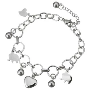 Dámský ocelový náramek zdobený zavěšenými přívěšky v podobě slonů, srdíček a kuliček Ocelový náramek je vyroben z chirurgické oceli s jakostním označením 316L Parametry materiál chirurgická ocel povrchová úprava lesklá délka náramku 20 cm rozměr přívěšků 10x10 mm, 11x12 mm