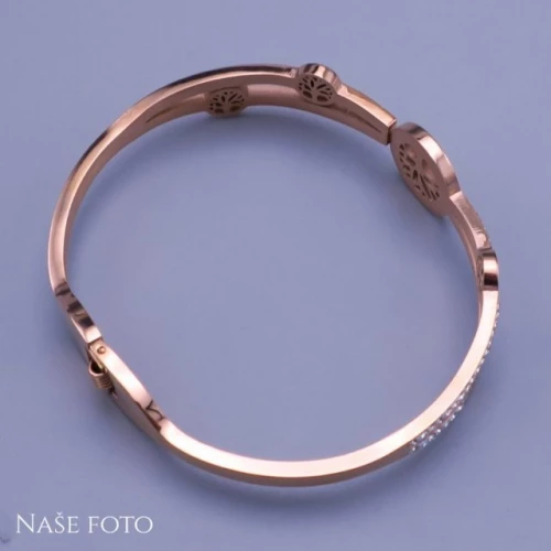 Luxusní RoseGold dámský náramek z pozlacené chirurgické oceli. Dominantou náramku jsou symboly stromu života rozmístěné v přední části náramku. Obvod náramku je zdoben třpytivými kamínky čiré barvy, díky kterému vypadá náramek velice luxusně. Barva rosegold (růžové zlato) je dnes moderní a oblíbená. Otvírání náramku je jednoduché na pružinu. Chirurgická ocel je vhodná pro osoby s alergiemi na běžné kovy. Délka náramku (vnitřní délka): 17 cm Šířka náramku (v nejširším místě): 14mm Otvírání náramku: pružinové 8057