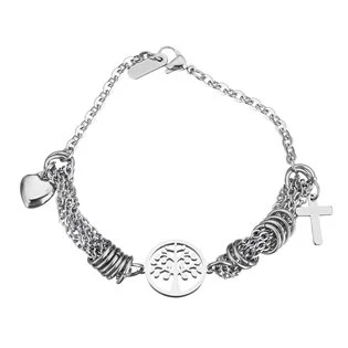 Dámský ocelový náramek zdobený přívěšky se symboly strom života, křížek a srdíčko Ocelový náramek je vyroben z chirurgické oceli s jakostním označením 316L Parametry materiál chirurgická ocel povrchová úprava lesklá délka náramku 20 cm rozměr kříže 10 x 14 mm rozměr srdíčka 10 x 11 mm rozměr stromu života 20 x 16 mm