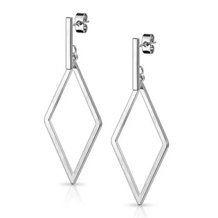Lesklé ocelové náušnice ve tvaru kosočtverců Náušnice jsou vyrobeny z chirurgické oceli s jakostním označením 316L Parametry materiál chirurgická ocel povrchová úprava lesklá typ uzávěru puzeta, visací výška náušnic 60 mm