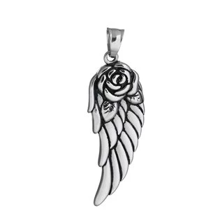 Ocelový přívěšek ve tvaru andělského křídla zdobeného růžičkou Přívěšek je vyroben z chirurgické oceli 316L Parametry materiál chirurgická ocel povrchová úprava černá, lesklá rozměr přívěšku 21 x 59 mm