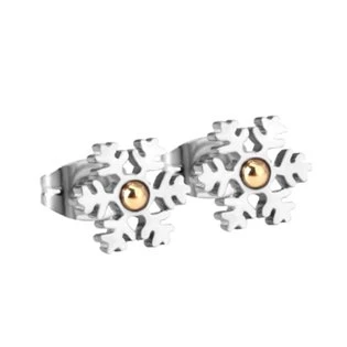 Ocelové náušnice ve tvaru svěhové vločky. Náušnice jsou dekorované zlaceným středem Náušnice jsou vyrobeny z chirurgické oceli s jakostním označením 316L Parametry materiál chirurgická ocel povrchová úprava lesklá, žluté zlato typ uzávěru puzeta
