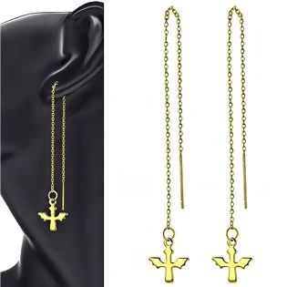 Ocelové provlékací náušnice se zavěšenými andělíčky Náušnice z chirurgické oceli 316L Parametry materiál chirurgická ocel povrchová úprava žluté zlato typ uzávěru provlékací délka náušnic 13 cm