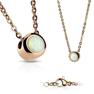 Zlacený dámský náhrdelník se přívěškem zdobeným bílým syntetickým opálem Šperk je vyroben z chirurgické oceli 316L se zlcenou povrchovou úpravou v barvě růžového zlata Parametry materiál chirurgická ocel povrchová úprava růžové zlato druh kamene opál rozměr kamene 6 mm rozměr přívěšku 9 mm šíře řetízku 2 mm délka náhrdelníku 50 cm