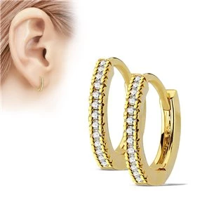 Dámské zlacené kruhové náušnice zdobené čirými zirkony Náušnice mají povrchovou úpravu v barvě žlutého zlata Parametry materiál obecný kov povrchová úprava žluté zlato druh kamene zirkon průměr náušnic 14 mm šíře náušnic 2 mm
