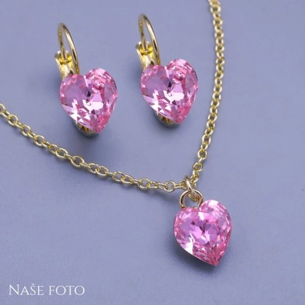 Jemná růžová souprava se srdíčky Swarovski, z pozlacené chirurgické oceli
