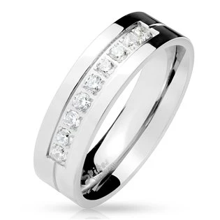 Ocelový prsten zdobený čirými zirkony Prsten je vyroben z chirurgické oceli s jakostním označením 316L Parametry materiál chirurgická ocel povrchová úprava lesklá šíře prstenu 6 mm druh kamene zirkon Vyberte variantu: 50 52 55 57 60 62 65