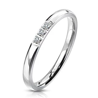 Jemný dámský prsten zdobený 3mi zirkonky čiré barvy Prsten je vyroben z oceli s jakostvím označením 316L Parametry materiál chirurgická ocel povrchová úprava lesklá šíře prstenu 2 mm druh kamene zirkon Vyberte variantu: 50 52 54 57 59