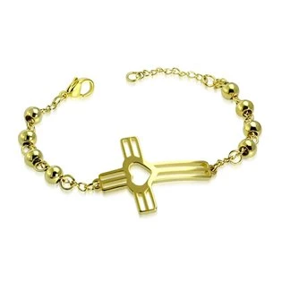 Zlacený ocelový náramek s křížem Náramek je vyroben z chirurgické oceli s jakostním označením 316L Parametry materiál chirurgická ocel povrchová úprava žluté zlato délka náramku 19 cm šíře náramku 6 mm