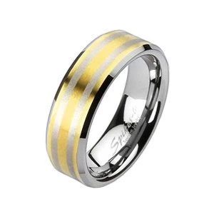 Vysoceleštěný wolframový prsten ve středové části v matném provedení zdobený zlatými proužky Wolfram je v současnosti nejtvrdší a nejodolnější kov, používaný k výrobě šperků. Wolframu je 10 krát tvrdší než 18ti karátové zlato a… 5 krát tvrdší než ocel … a 4 krát tvrdší než Titan. Stupeň tvrdosti wolframu se pohybuje mezi 8-9 na stupnici tvrdosti (diamanty mají tvrdost 10 - nejvyšší na této stupnici). Proč je to toto důležité? Vysoká tvrdost wolframu zaručuje trvalý lesk šperků a jeho absolutní odolnost proti poškrábání. materiál karbid wolframu šíře prstenu 8 mm Vyberte variantu: 65 70