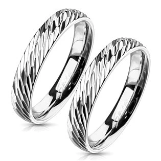 Snubní prsteny zdobené dekorativními zářezy Pro pohodlné nošení jsouu prsteny vnitřně bombírované - zaoblené Prsten je vyroben z chirurgické oceli s jakostním označením 316L Tento druh oceli nekoroduje (prsteny tedy nerezaví), je antialergenní a splňuje náročné parametry pro šperky přicházející do styku s pokožkou, které jsou dány normami EU materiál chirurgická ocel povrchová úprava lesklá šíře prstenu 4 mm typ prstenu snubní Dámský ocelový snubní prsten - vyberte variantu: 50 52 55 57 60 62 Pánský ocelový snubní prsten - vyberte variantu: 55 57 60 62 65 68