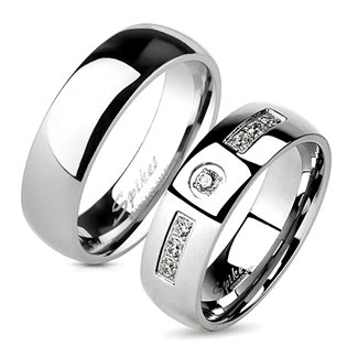 Ocelové snubní prsteny s leštěným povrchem. Dámský prsten je dekorovám zirkony čiré barvy Tento pár prstenů je vyrben z chirurgické oceli s jakostním označením 316L materiál chirurgická ocel povrchová úprava lesklá šíře dám. prstenu 6 mm šíře pán. prstenu 6 mm druh kamene zirkon typ prstenu snubní Pánský snubní prsten šíře 6 mm - vyberte variantu: 55 57 59 60 62 65 67 70 Dámský ocelový prsten - vyberte variantu: 50 52 55 57 V případě zájmu uveďte velikosti prstenů do poznámky