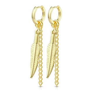 Visací ocelové náušnice kroužky dekorované ozdobným řetízkem a přívěškem ve tvaru peříčka Náušnice jsou vyrobeny z chirurgické oceli s jakostním označením 316L s povrchovou úpravou v barvě žlutého zlata materiál chirurgická ocel povrchová úprava žluté zlato typ uzávěru kroužek, visací