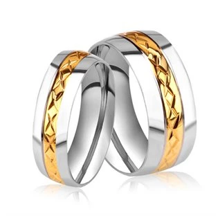 Zlacené snubní prsteny z chirurgické oceli zdobený tradičním křížkovým dekorem Ocelový prsteny jsou vyrobeny z chirurgické oceli s jakostním označením 316L materiál chirurgická ocel povrchová úprava lesklá, žluté zlato šíře dám. prstenu 6 mm šíře pán. prstenu 8 mm druh kamene bez kamene typ prstenu snubní Dámský ocelový prsten, šíře 6 mm - vyberte variantu: 50 52 54 57 60 Pánský ocelový prsten, šíře 8 mm - vyberte variantu: 54 57 60 62 64 V případě zájmu upřesněte velikost pstenů do poznámky
