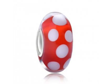 Krásný červený skleněný korálek s bílými puntíky,