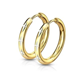 Zlacené ocelové náušnice kroužky zdobené křížkovým dekorem Náušnice jsou vyrobeny z chirurgické oceli s jakostním označením 316L a mají povrchovou úpravu v barvě žlutého zlata materiál chirurgická ocel povrchová úprava žluté zlato typ uzávěru kroužek průměr náušnic 16 mm šíře náušnic 2 mm