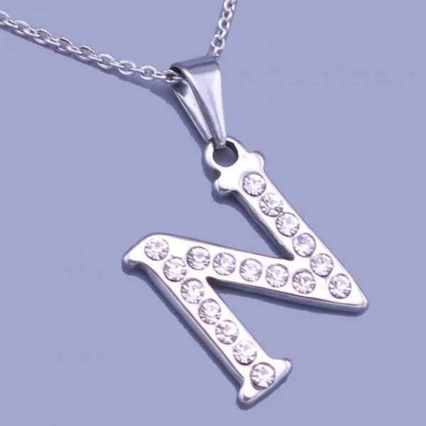Přívěsek z leštěné chirurgické oceli písmeno N je zdobeno čirými zirkony. Velikost 17x13mm Součástí přívěsku je ocelový řetízek, který si můžete vybrat z šířek 1,2mm , 2mm. Délka na výběr od 40-45-50-55-60-65-70cm P032