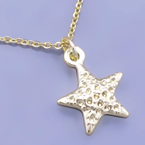 Jednostranná hvězda z leštěné chirurgické oceli srdíčko je povrchově upraveno zlacením 14kar. v ČR v odstínu českého zlata bez niklu. Velikost 14x13mm. Hvězdička je navléknuta na zlaceném řetízku z chirurgické oceli o šířce 1mm. Délka na výběr od 40-45-50cm PZ021
